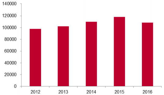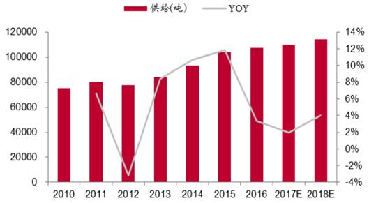 在矿产钴产量下降时,2016 年全球钴精矿产量却实现同比增加,全年产量 10.75 万吨,同比增长 3% 左右。这表明全球钴市场已开始原料库存消化阶段。2017-2018 年全球钴供给量将分别以 2%、4%的增 速增长,即 2017 年全球供给达到 10.9 万吨,2018 年为 11.4 万吨。